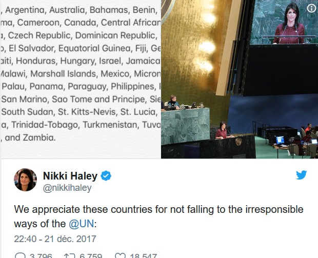 وأرسلت البعثة الأمريكية لدى الأمم المتحدة خطابات رسمية بالدعوة للمثلي تلك الدول أبلغتهم فيها بدعوتهم إلى العشاء يوم 3 يناير/كانون الثاني 2018 تقديرا لمواقفهم الرافضة للقرار الأممي.