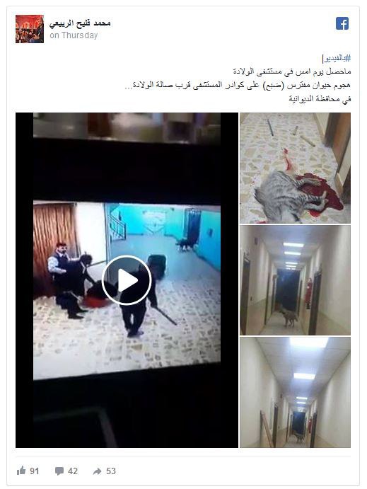 وتداول عراقيون على مواقع التواصل الاجتماعي مقطع فيديو وصوراً تُظهر اقتحام ضبع لمستشفى للأطفال في محافظة الديوانية (180 كلم جنوب بغداد)، وظهر في المقطع المصور الذي التقطته كاميرا مراقبة داخل المستشفى حالة من الهلع، ومحاولة رجال الأمن القضاء على الحيوان باستخدام العصي.