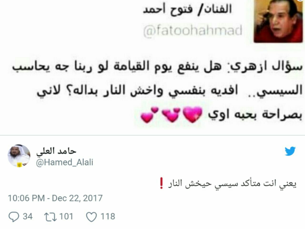 وكان بعض مستخدمي مواقع التواصل الاجتماعي تناقلوا تغريدة متننسوبة للفنان فتوح أحمد قال فيها : “سؤال أزهري: هل ينفع يوم القيامه لو ربنا جه يحاسب السيسي .. افديه بنفسي واخش النار بداله. لاني بصراحه بحبه أوي”.