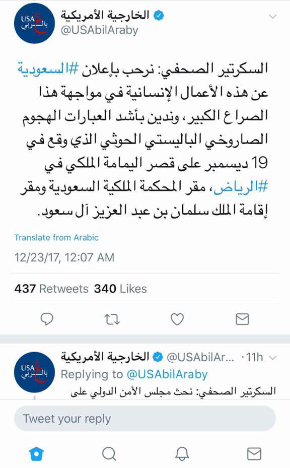 هذا هو حال تحالف العدوان فبعد إطلاق صاروخ بركان تو اتش على قصر اليمامة في الرياض والتصريحات السعودية باعتراضه خرج سكرتير البيت الأبيض بتصريحات نشرت السبت على موقع تويتر التابع لوزارة الخارجية الأمريكية اعترفت في مضمونها باستهداف قصر اليمامة مقر إقامة الملك السعودي معلنة بذلك فشل أنظمتها الدفاعية ولم يجد النظام السعودي في ذلك الوقت إلا بلع لسانه.