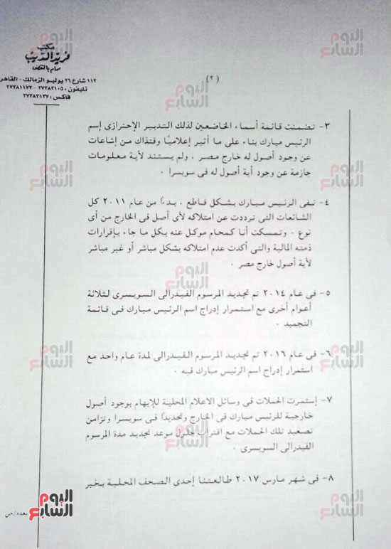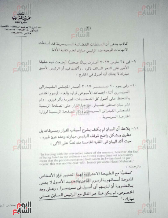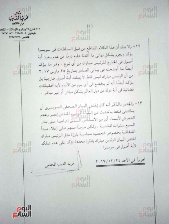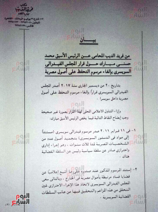 وعرض موقع "اليوم السابع" بيان المحامي فريد الديب، بشأن حقيقة أموال محمد حسني مبارك في الخارج، والتي أوضح فيه ملابسات قرار المجلس الفيدرالي السويسري بإلغاء مرسوم التحفظ على أموال "مبارك".