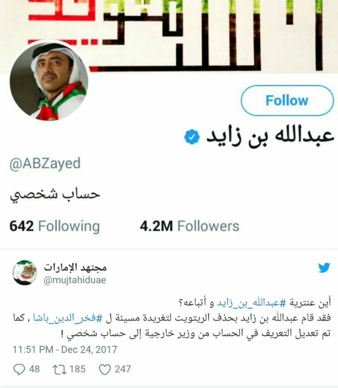 وأكد ناشطون منهم حساب المدون الإماراتي الشهير “مجتهد الإمارات” حذف عبدالله بن زايد للتغريدة، وعلق أيضا مهاجما وزير خارجية الإمارات “أين عنترية #عبدالله_بن_زايد و أتباعه؟ فقد قام عبدالله بن زايد بحذف الريتويت لتغريدة مسيئة ل #فخر_الدين_باشا ، كما تم تعديل التعريف في الحساب من وزير خارجية إلى حساب شخصي !”