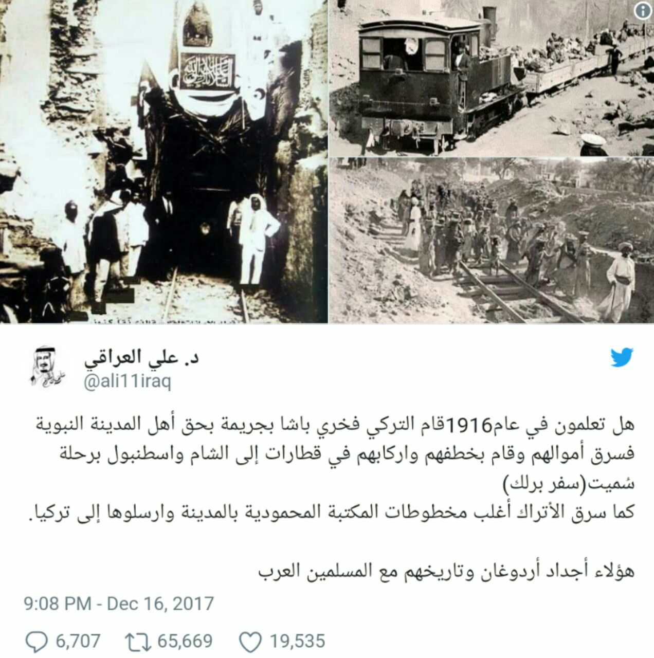 وادعى “العراقي” في تغريدته أن الأمير فخر الدين باشا في عام 1916م قام بسرقة أموال أهل المدينة وخطفهم وترحيلهم إلى الشام وإسطنبول برحلة سُميت (سفر برلك) وزعم سرقة الأتراك لأغلب مخطوطات المكتبة المحمودية بالمدينة وإرسالها إلى تركيا.