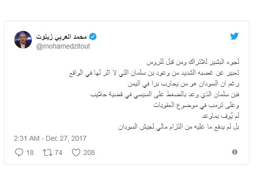 ودون “زيتوت” في تغريدة له بـ”تويتر” رصدتها (وطن) مثيرا جدلا جديدا حول الاتفاق بين البشير وأردوغان ما نصه:”لجوء البشير للاتراك ومن قبل للروس تعبير عن غضبه الشديد من وعود بن سلمان التي لا اثر لها في الواقع”