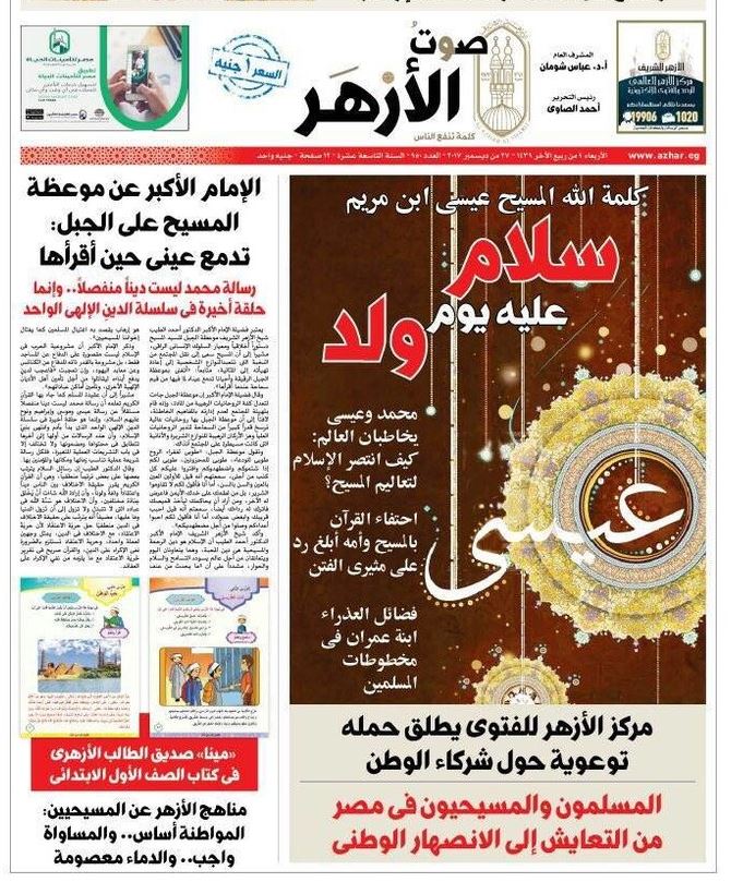 ونشرت "صوت الأزهر" على صفحتها الأولى صورة احتفالية كتب عليها: "كلمة الله المسيح عيسى ابن مريم... سلام عليه يوم ولد". كما تضمنت عناوين بعض المواضيع الخاصة بالعيد، ومنها: "محمد وعيسى يخاطبان العالم: كيف انتصر الإسلام لتعاليم المسيح؟"، و"احتفاء القرآن بالمسيح وأمه أبلغ رد على مثيري الفتن"، و"فضائل العذراء ابنة عمران في مخطوطات المسلمين".