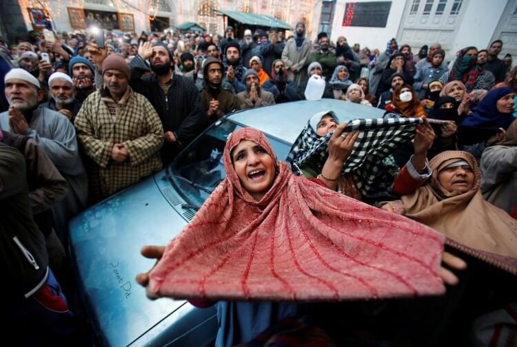 مسلمون كشميريون يرفعون ايديهم بعد رؤية بقايا الشيخ الصوفي "عبد القادر الجيلاني "في ضريحه خلال ذكرى وفاته في سريناجار.