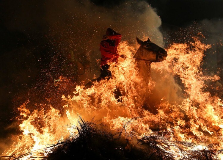 رجل يعبر من خلال النيران وهو يركب حصانه خلال احتفال "لومينارياس" السنوي في قرية سان بارتولومي دي بيناريس، شمال غرب مدريد، إسبانيا