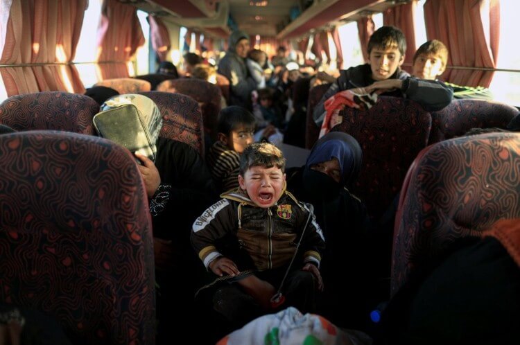 طفل صغير يبكي وهو يجلس مع عائلته في حافلة أثناء إجلاء العائلات من قرية يسيطر عليها مسلحو تنظيم داعش، للتوجه إلى مخيم حمام العليل للنازحين من الموصل، العراق.