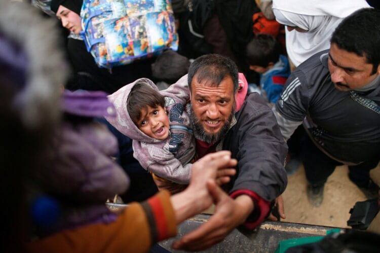 عراقي نازح يحمل ابنه ويستعد لنقله على متن شاحنة برفقة آخرين إلى مكان آمن، في الوقت الذي اندلعت فيه المعارك بين القوات العراقية ومقاتلي تنظيم داعش غرب الموصل، العراق.