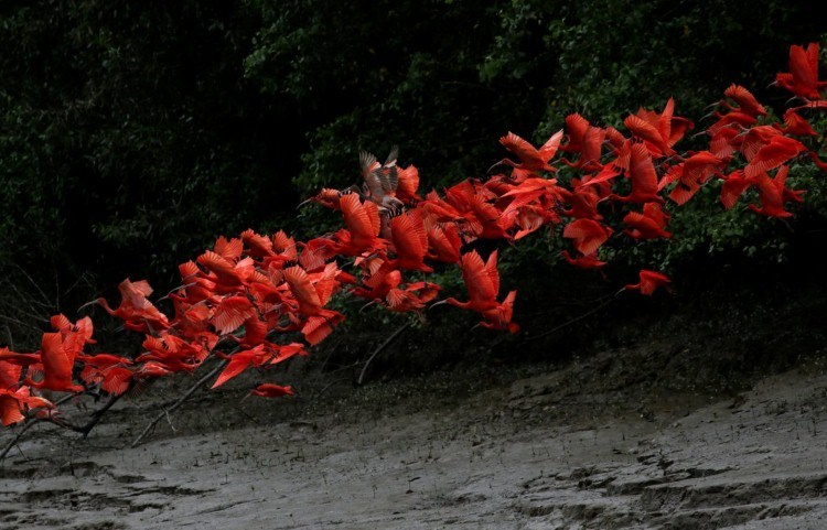 طيور أبو منجل القرمزية تُحلق على مقربة من ضفاف مستنقع المانغروف عند مصب نهر Calcoene على ساحل ولاية أمابا شمال البرازيل.