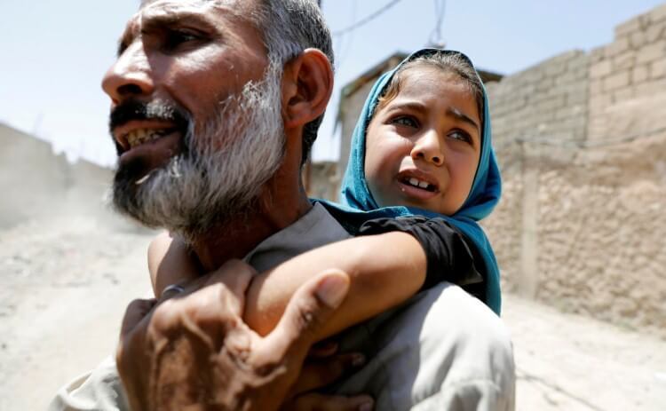 رجل يحمل ابنته على ظهره بعد أن فروا من منزلهم بسبب القتال الدائر بين القوات العراقية ومسلحي داعش في الموصل.