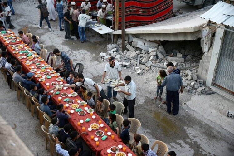 اجتماع الناس للإفطار خلال شهر رمضان المبارك وسط المباني المدمّرة في حي دوما.