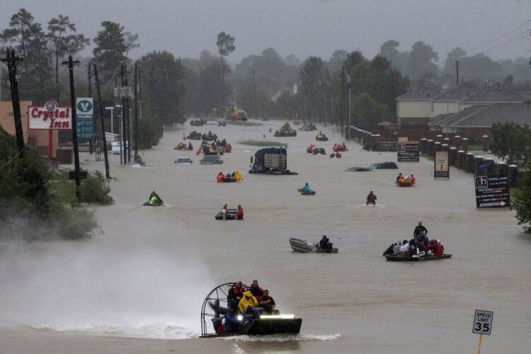 سكان يستعملون القوارب للتنقل في الشارع بعد أن غمرت الشوارع مياه الفيضانات الناجمة عن إعصار هارفي شرق هيوستن، تكساس.