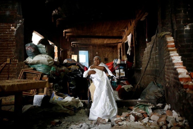 مسنة تحمل فستان زفافها داخل منزلها المدمَّر بفعل الزلزال الذي ضرب سان خوان في المسكيك.