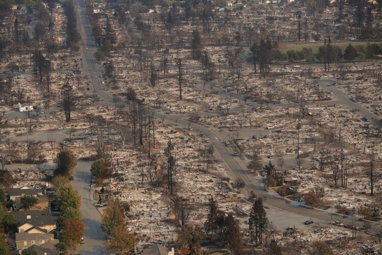 صورة جوية تُظهر الدمار الذي لحق بالأحياء السكنية في سانتا روزا بفعل حرائق الغابات التي امتدت للأحياء المأهولة في كاليفورنيا.