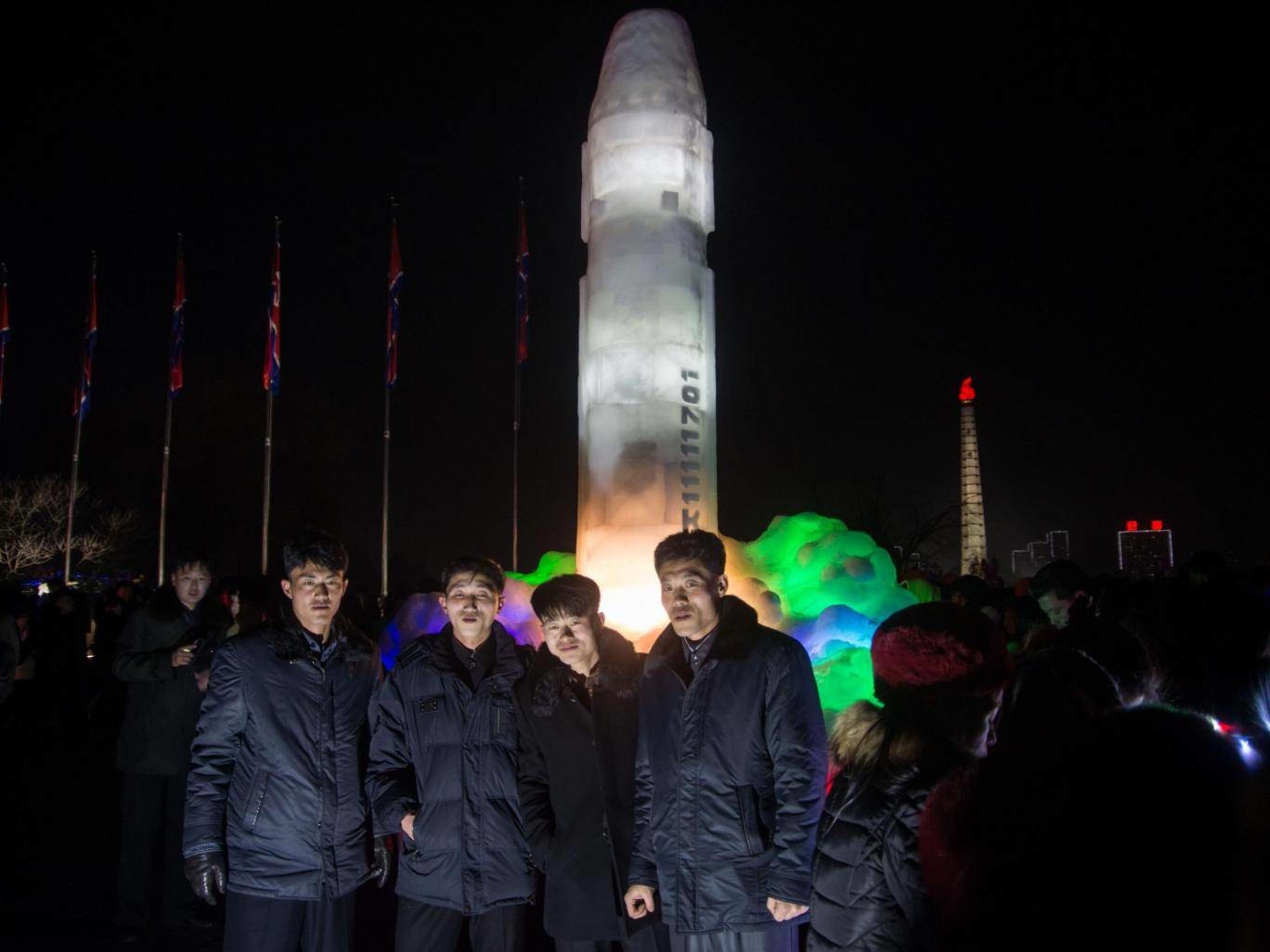 ونشرت وسائل الإعلام الكورية الشمالية الرسمية صورا تظهر المواطنين المحتفلين بعيد رأس السنة في ساحة كم إل سونغ، وخلفهم تمثال هائل يشبه صاروخ "هواسونغ 15" الباليستي العابر للقارات والذي أعلنت بيونغ يانغ عن اختباره الناجح في أواخر نوفمبر/تشرين الثاني من العام المنصرم.