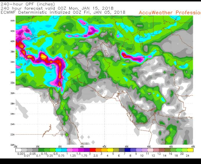 المتنبيء الجوي الاردني خالد مهداوي اوضح ظهر اليوم الجمعة (5 كانون الثاني 2018) انه ومع تحرك المنخفض مساء اليوم لشمال شرق المتوسط يتوقع أن يؤثر على العراق بامطار متوسطة غالبا وشديدة أحياناً والحاله تخدم بالدرجة الاولى شمال وغرب العراق مع احتمالية ضعيفة للوسط والجنوب.