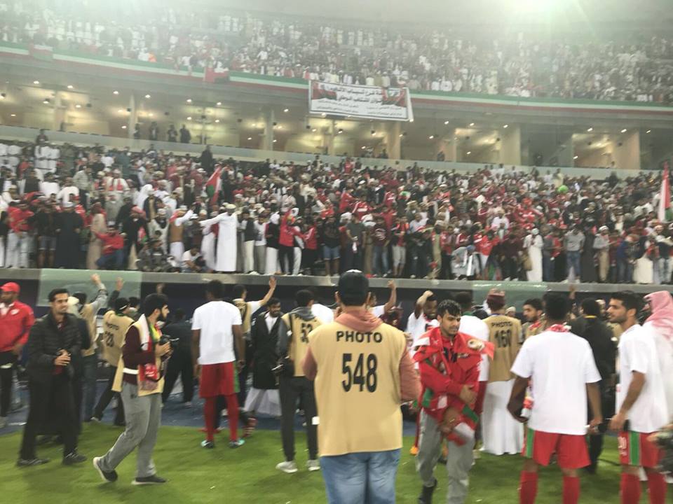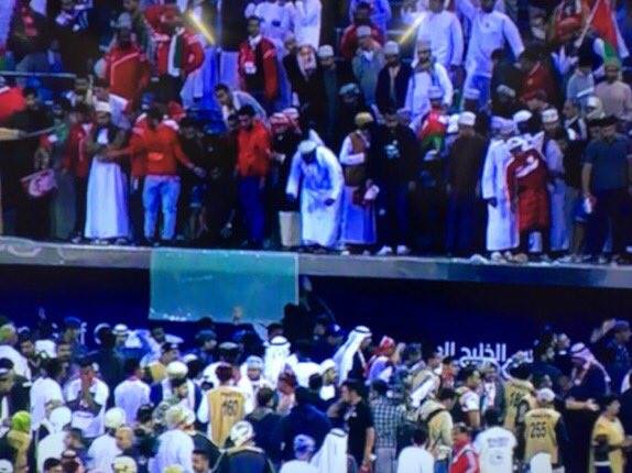 ويظهر المقطع المتداول على نطاق واسع، انهيارا مفاجئا للحاجز الزجاجي الذي يبدو أنه حدث بسبب ضغط جماهير عمان وفرحتهم بعد انتزاع منتخبهم اللقب على حساب الإمارات.