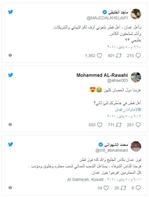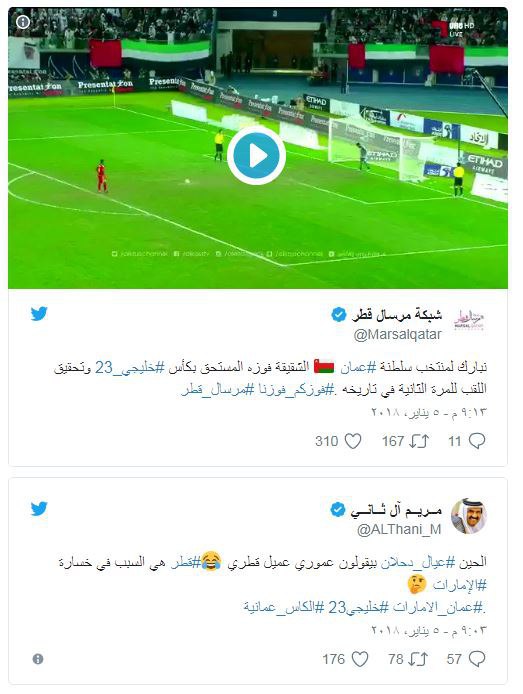 كما عبر العديد من القطريين في تغريداتهم عن فرحتهم العارمة، بعد فوز منتخب السلطنة على منتخب الإمارات وانتزاع اللقب للمرة الثانية.