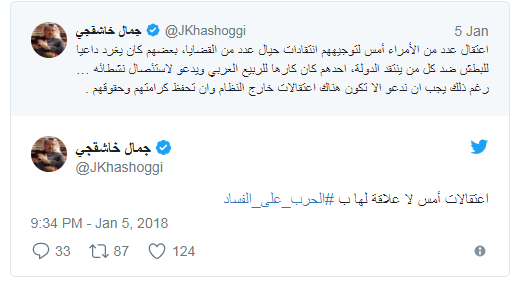 وأضاف خاشقجي في تغريدة لاحقة أن التغريدات لم يكن لها علاقة بالحرب على الفساد.