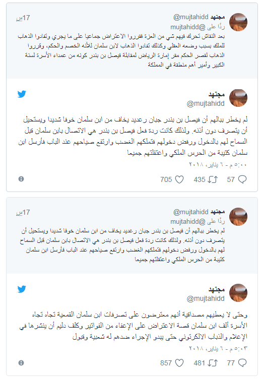 وأضاف مجتهد في تغريدات على تويتر، أن أمراء ذهبوا بعد نقاش بينهم إلى قصر الحكم، مقر إمارة الرياض، لمقابلة فيصل بن بندر، كونه من عمداء الأسرة لسنه الكبيرة، وأمير أهم منطقة، وتفادوا الذهاب للملك بسبب وضعه العقلي، وكذلك تفادوا الذهاب لابن سلمان لأنه الخصم والحكم.