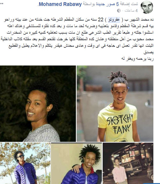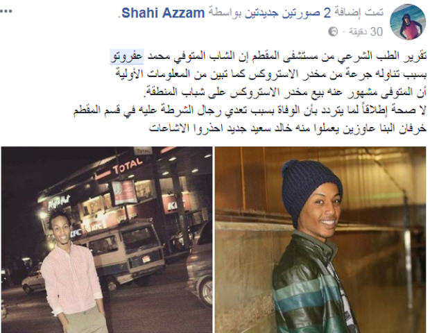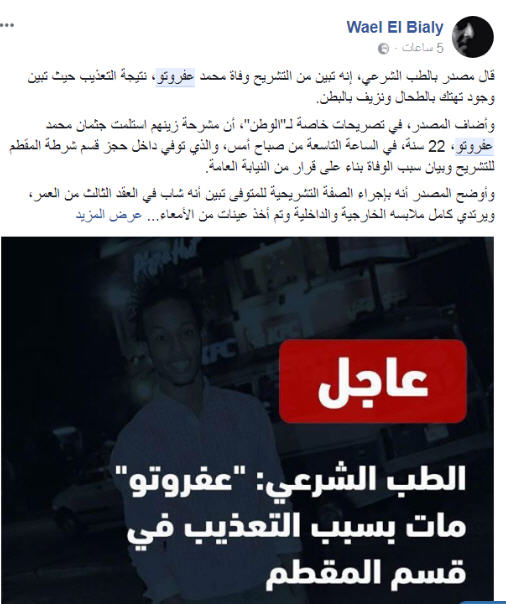 فقال ناشط يدعى أبو العز: “مقتل الشاب عفروتو على يد قوات الأمن بقسم شرطة المقطم نتيجة التعذيب.. يذكرنا بخالد سعيد الذي قتل بالإسكندرية”.
