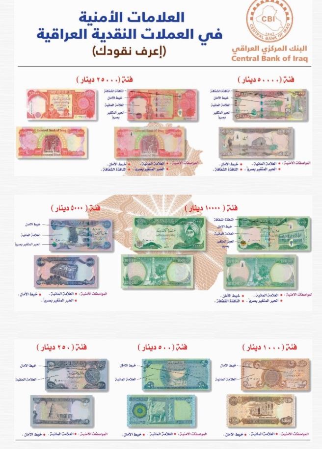 وبين البنك ان ابرز هذه العلامات هو خيط الامان والعلامة المائية والحبر المتغير بصريا.