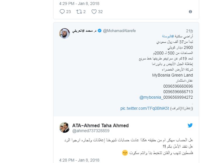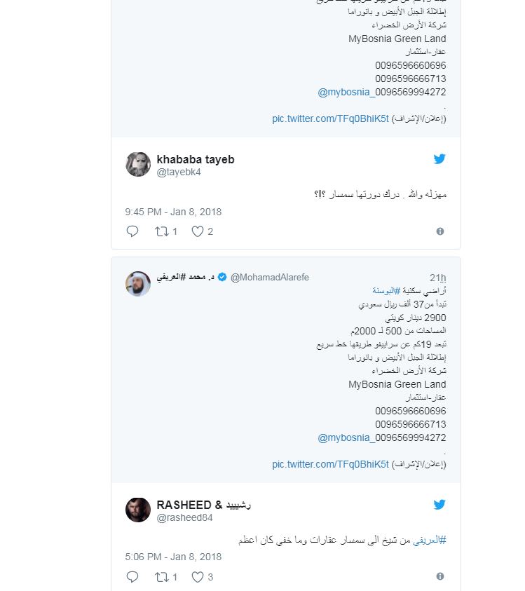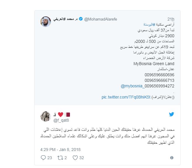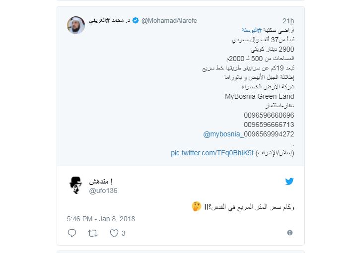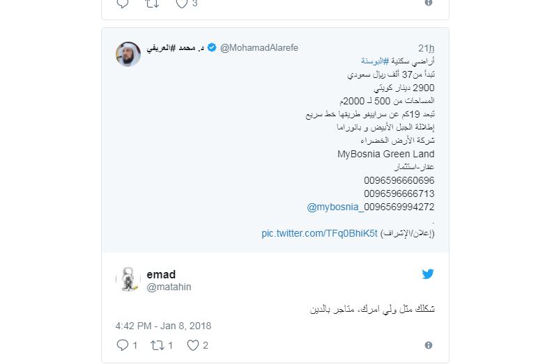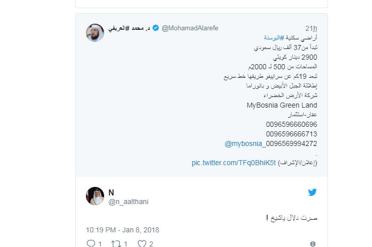 وعبر حسابه بموقع التدوين المصغر “تويتر”، أعلن “العريفي” لمتابعيه عن وجود قطع أراض في “البوسنة” قائلا: ” أراضي سكنية #البوسنة تبدأ من37 ألف ريال سعودي 2900 دينار كويتي المساحات من 500 لـ 2000م تبعد 19كم عن سراييفو طريقها خط سريع إطلالة الجبل الأبيض و بانوراما شركة الأرض الخضراء MyBosnia Green Land عقار-استثمار”.