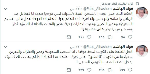 وقال “الهاشم” في تدوينات له عبر حسابه بموقع التدوين المصغر “تويتر”:” الحل للضغط على الكويت لتتخذ موقفا : ان تسحب السعودية ومصر والامارات والبحرين سفراءها من الكويت “للتشاور” حتى نعرف خاتمة هذا الحياد ! اذا لم يحدث ذلك فسوف يدخل نصف الشعب الكويتي للسجن !”.