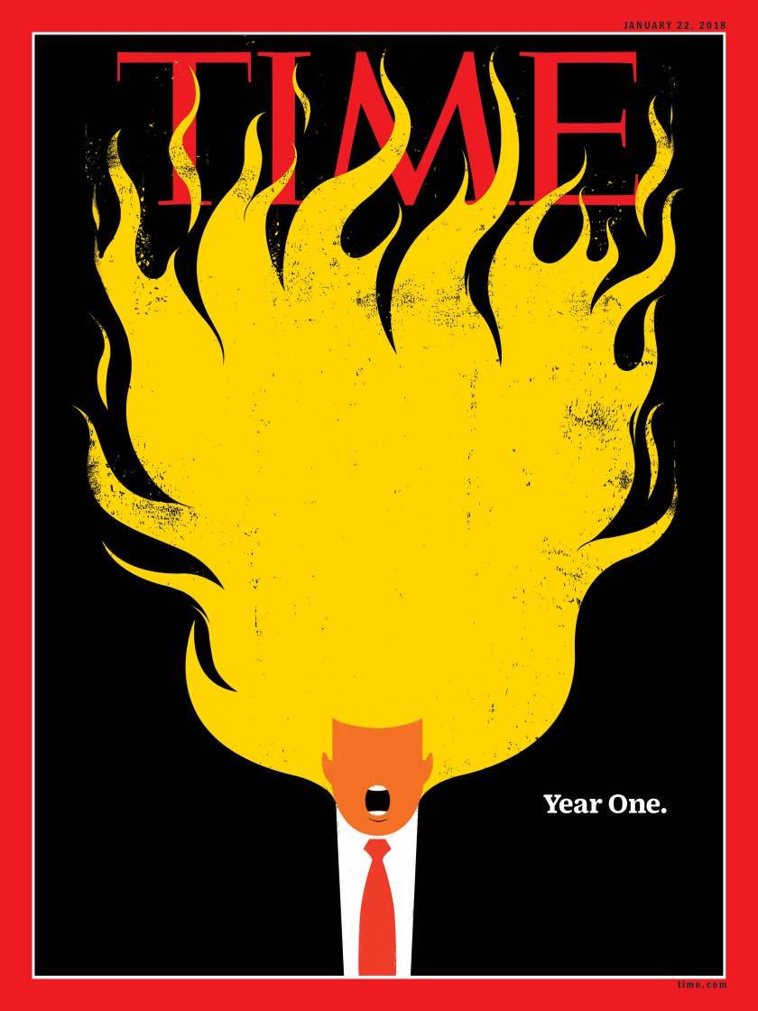 وظهر ترامب وهو يصرخ بشعره المميز وكأنه يحترق، وقال مصمم الغلاف إيديل رودريجيز، إن تلك النيران هي إشارة إلى كتاب الصحفي الشهير مايكل وولف عن كواليس إدارة ترامب، والذي حمل عنوان "النار والغضب: داخل البيت الأبيض لترامب".