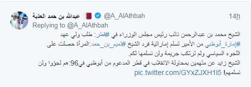 وقال في تغريدة أخرى: "لماذا رفضت إمارة أبوظبي على لسان الشيخ زايد رحمه الله تسليم القطريين الذين كانت أبوظبي معهم ودعمتهم بمحاولة الانقلاب الدموي الفاشل ضد صاحب السمو الأمير الوالد الشيخ حمد بن خليفة في 1996 ويطلب ولي عهد الإمارة تسليم "امرأة" إماراتية في 2015 لم تقم بمحاولة إنقلاب دموي بالإمارة؟"