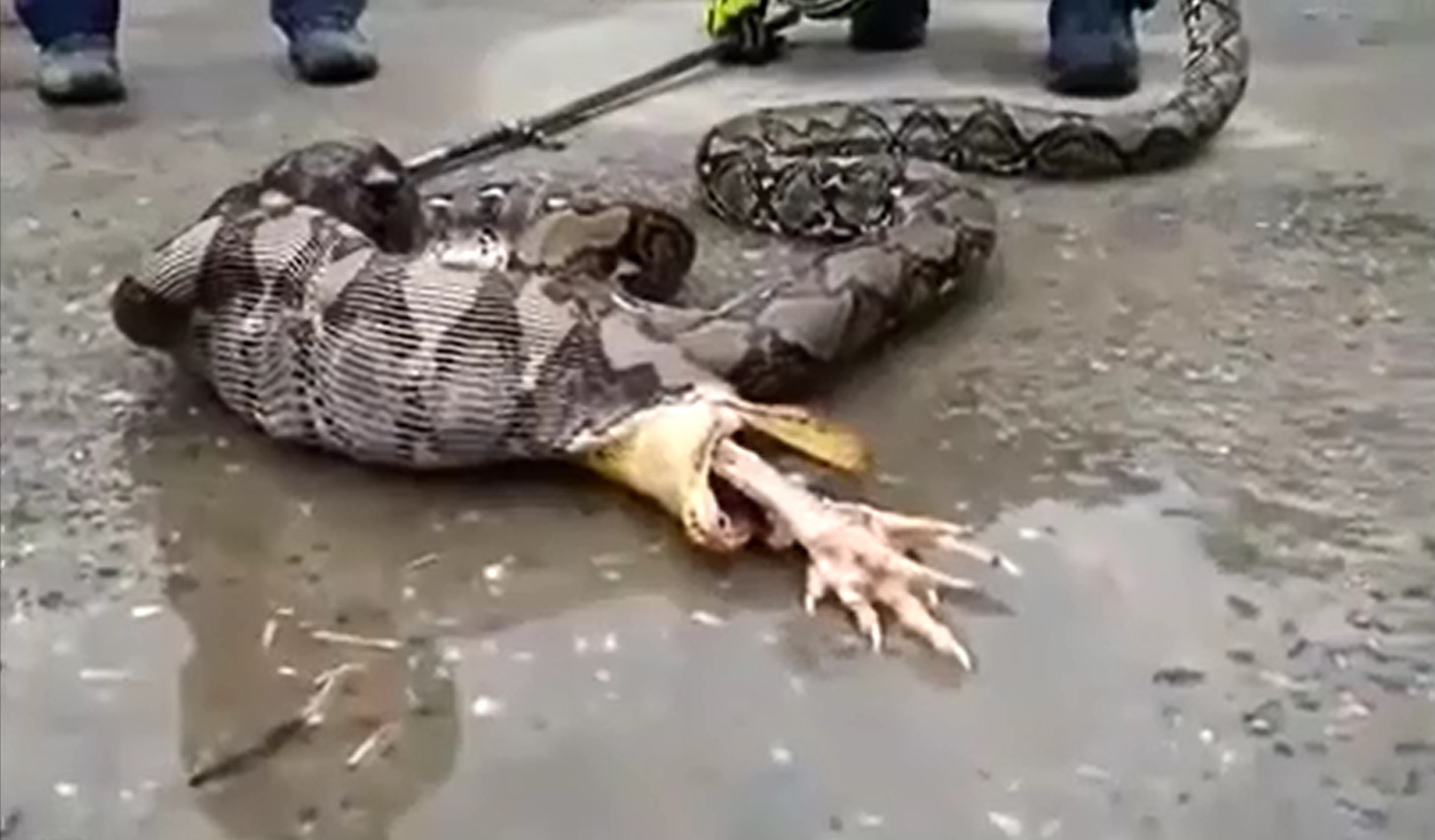 وساعد رجال الإنقاذ المزارع في القبض على الثعبان الضخم، والتقطوا مقطع فيديو للحظة تقيؤ الثعبان للديوك ببطء.
