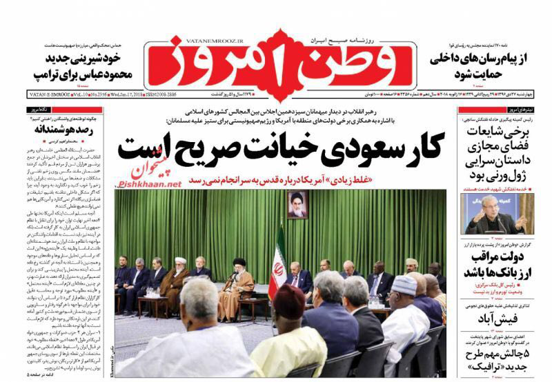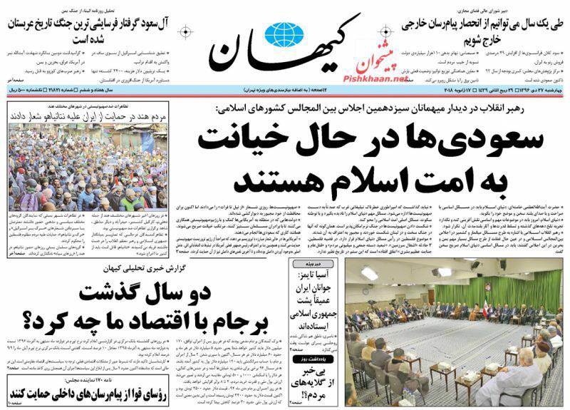 تداولت الصحف الايرانية الصادرة الاربعاء بطهران، عددا من القضايا المحلية والاقليمية والدولية، من ابرزها كلمة قائد الثورة الاسلامية خلال استقبال المشاركين في مؤتمر اتحاد البرلمانات الاسلامية الذي استضافته طهران لدورته الثالثة عشرة.