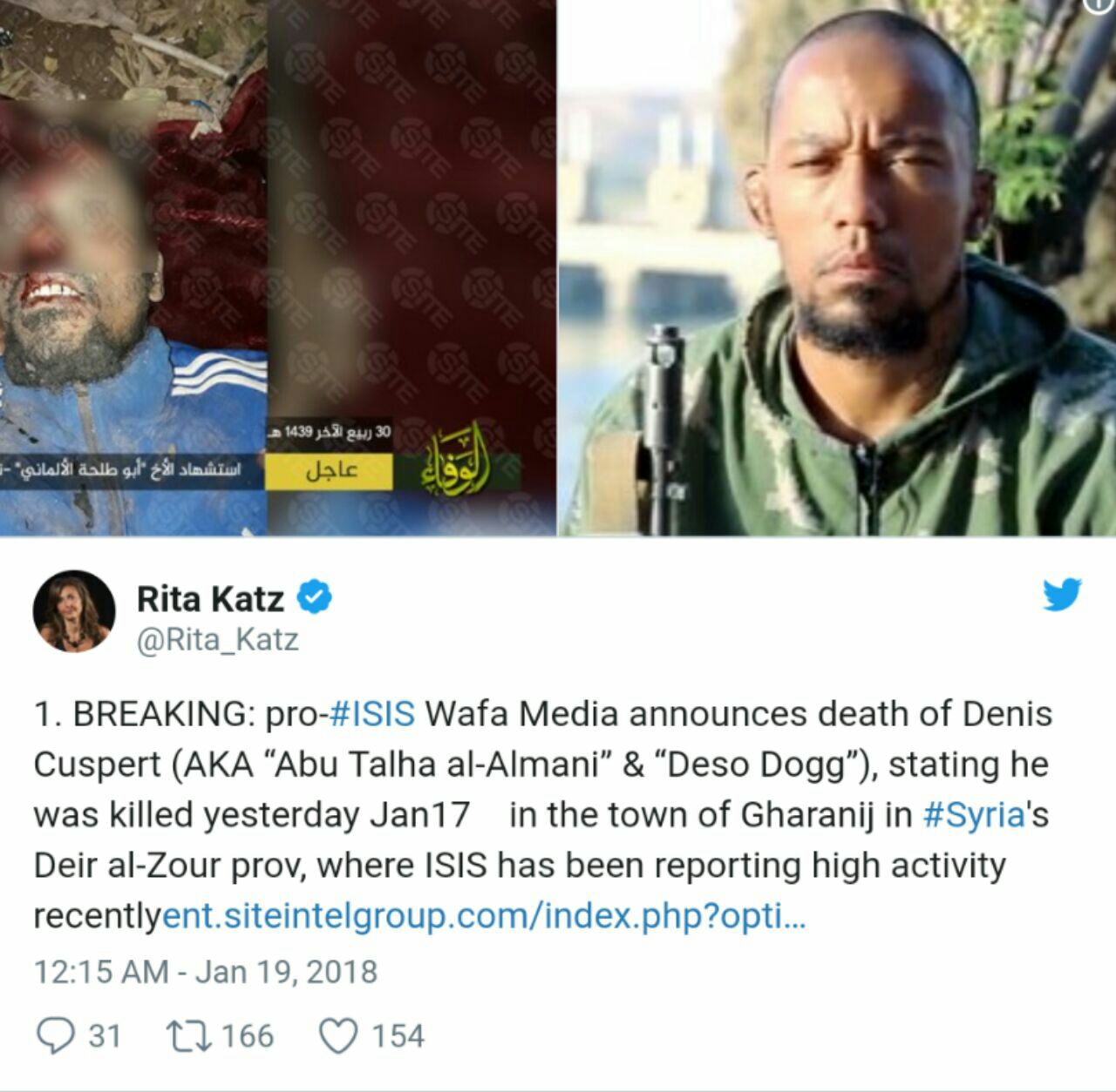 وكان دينيس كوسبيرت المعروف باسم الشهرة "ديسو دوغ" وبالكنية "أبو طلحة الألماني"، أحد أشهر المقاتلين الأجانب في التنظيم، وظهر في عدة تسجيلات دعائية أحدها كان فيه على ما يبدو ومعه رأس مقطوعة.