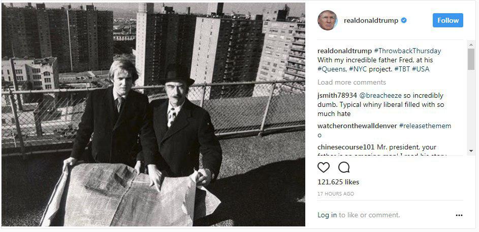 وبالإنتقال الى صورة ترامب مع والده، نلاحظ شبهاً واضحاً بينهما، وكتب تحتها  الرئيس: "مع والدي الرائع فريد في نيويورك".
