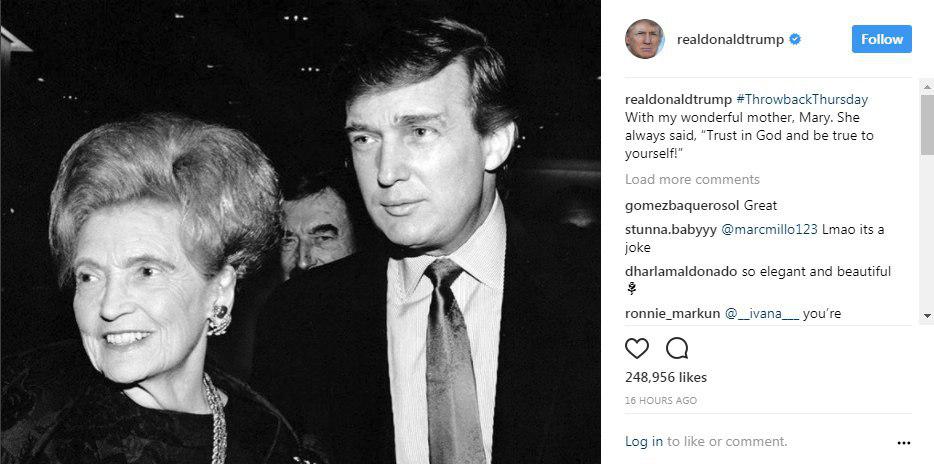 وأرفق ترامب الصورة بتعليق جاء فيه: "مع والدتي الجميلة ماري. فهي دائماً تقول: ثق بالله وكن صادقاً مع نفسك".