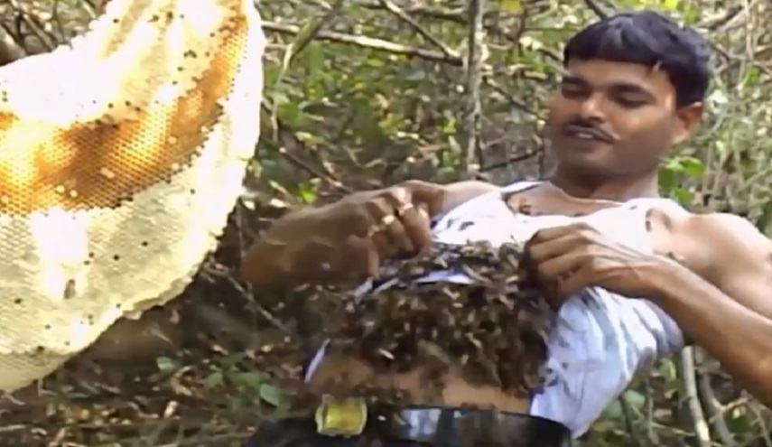 وظهر الرجل، من البنجال بالهند، في الفيديو وهو يضع النحل أسفل ملابسه بقبضة يده واستمر في ذلك حتى امتلأ التيشرت الخاص به، ثم أطلق سراح النحل في مشهد غريب بدى النحل بها وكأنه يفر من محبس.