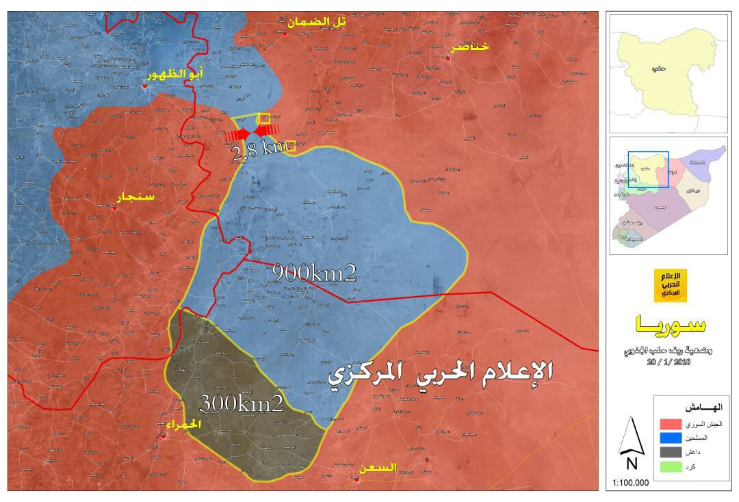 تولى الحزب الاسلامي التركستاني الذي تدعمه تركيا معارك الدفاع عن المطار بعد فرار مجموعات النصرة والمسلحين السوريين، فيما يحاصر الجيش الآن بقايا الارهابيين من المنطقة الممتدة شرق السعن الى شرق مطار ابو الضهور العسكري.