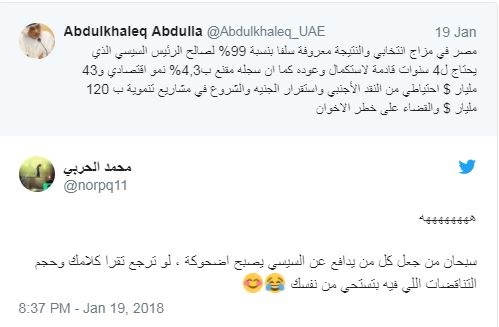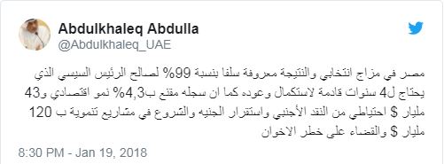 ودون مستشار “ابن زايد” في تغريدة له بـ”تويتر” رصدتها (وطن) ما نصه “مصر في مزاج انتخابي والنتيجة معروفة سلفا بنسبة 99% لصالح الرئيس السيسي الذي يحتاج ل4 سنوات قادمة لاستكمال وعوده كما ان سجله مقنع ب4,3% نمو اقتصادي و43 مليار $ احتياطي من النقد الأجنبي واستقرار الجنيه والشروع في مشاريع تنموية ب 120 مليار $ والقضاء على خطر الاخوان”