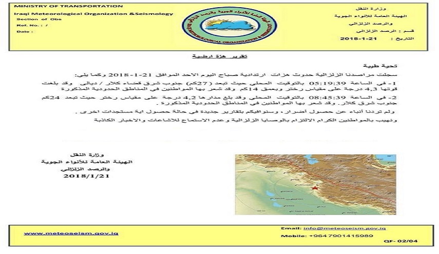 واوضح ان "الهزة الاولى التي كانت في الساعة 5.19 صباحا قد بلغت قوتها 4.3 على مقياس رختر وتبعد 27 كم جنوب شرق قضاء كلار – ديالى، فيما حدثت الثانية في الساعة 8.45 صباحا وبقوة تبلغ 4.2 درجة على مقياس رختر وتبعد 24 كم جنوب شرق كلار".