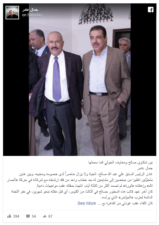 وقال عامر، في منشور على صفحته عبر "الفيسبوك"، إن اللقاء مع الحوثي جاء عقب اللقاء الذي جمعه بعلي عبدالله صالح قبل مقتله بشهرين، مؤكداً أن الأخير شكى من "قضايا لها علاقة بالشراكة وإدارة الحكومة، ورمى أسبابها على من أصبحوا سلطة في صنعاء، مستثنياً عبد الملك الحوثي"، وذلك وفقا لصحيفة "الوسط" اليمنية.