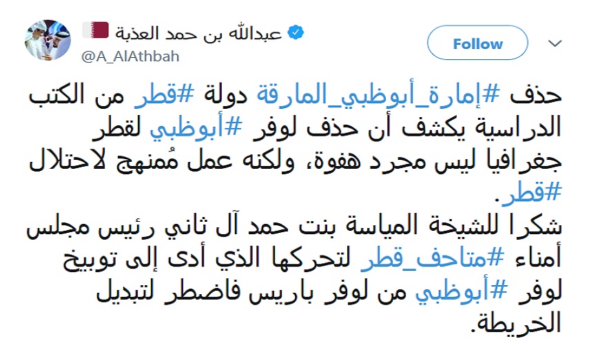 وليست هذه المرة الاولى التي تقوم بها أبو ظبي بهذا الأجراء، فقد أظهرت خريطة تم وضعها في متحف “اللوفر أبو ظبي” قبل ايام عن عدم احتوائها على خريطة قطر، الامر الذي تدراكته أبو ظبي وادعت ان الامر مجرد هفوة بسيطة، وذلك خوفا من من الاجراءات الجزائية من المتحف الأم في باريس الذي رفض مثل هذا الإجراء.