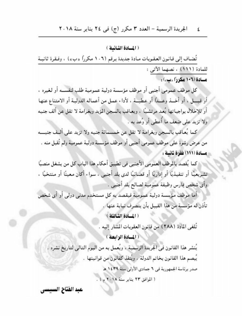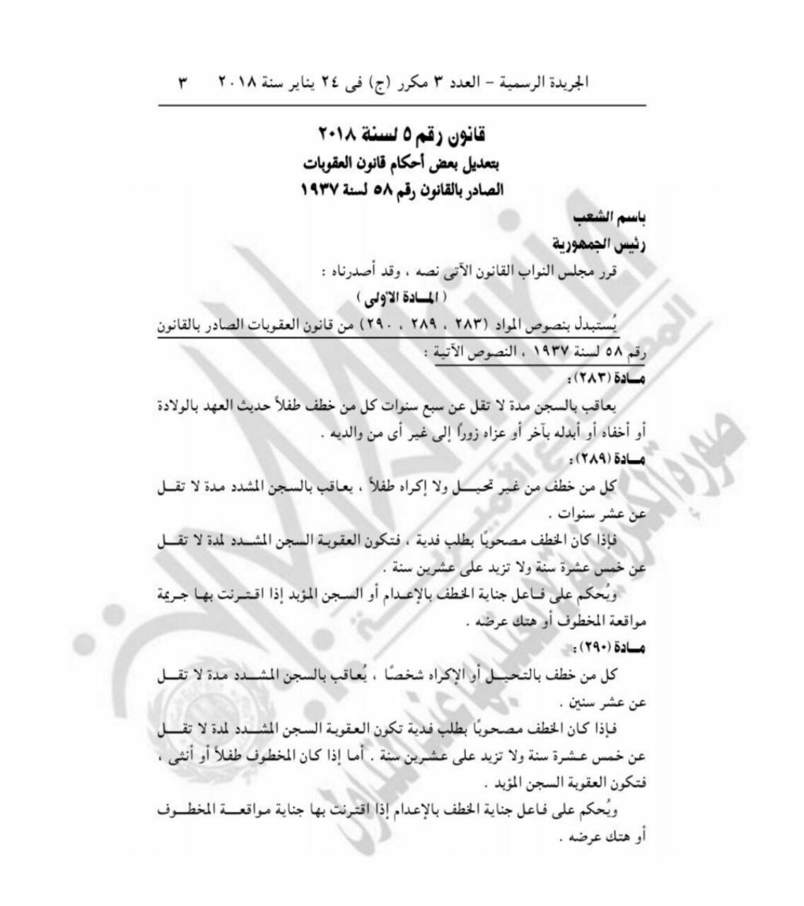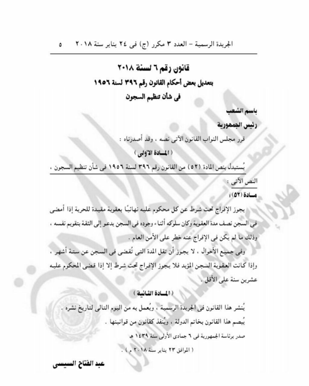 قرر الرئيس المصري السيسي، بتعديل بعض أحكام قانون العقوبات الصادر بالقانون رقم 58 لسنة 1937، كما أصدر قانونا بتعديل بعض أحكام القانون رقم 396 لسنة 1956 فى شأن تنظيم السجون.
