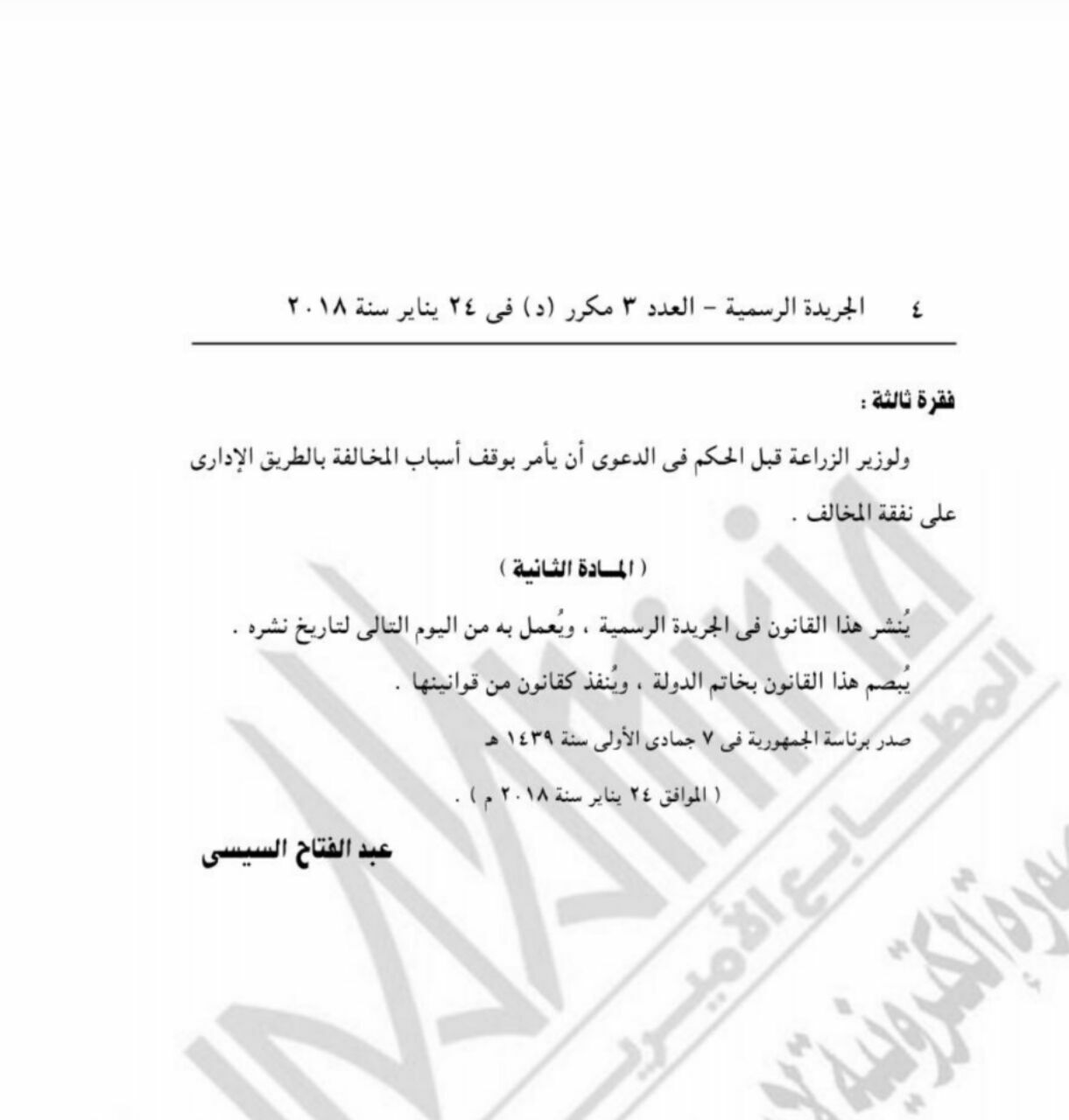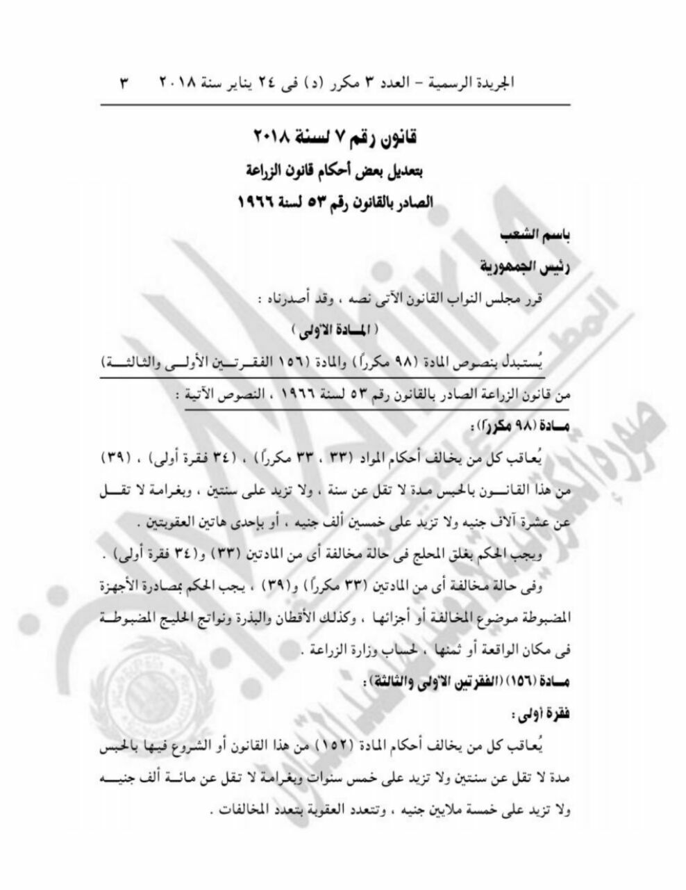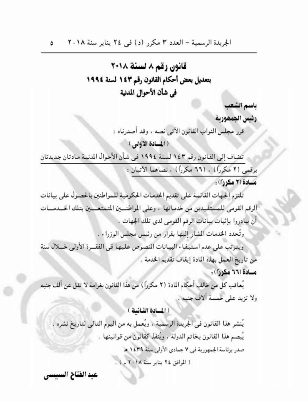 وأصدر الرئيس المصري السيسي قانونا بتعديل بعض أحكام قانون الزراعة الصادر بالقانون رقم 53 لسنة 1966، وتعديل بعض أحكام القانون رقم 143 لسنة 1994 فى شأن الأحوال المدنية.