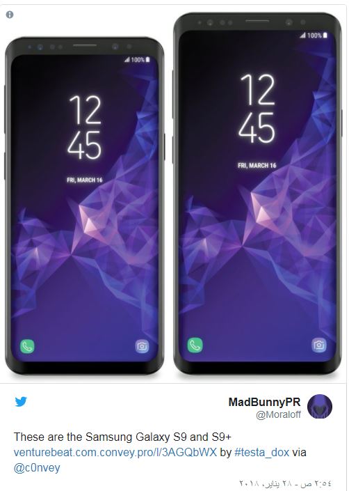 وانتشرت، أمس، على شبكة الإنترنت صور جديدة لهواتف "غالاكسي إس 9" و"إس 9+". وأعاد موقع "VB" نشر تلك الصور، التي قيل إنها التصميم النهائي لهواتف سامسونغ الجديدة، التي سيتم الكشف عنها خلال مؤتمر خاص بالشركة، بالتزامن مع معرض برشلونة.