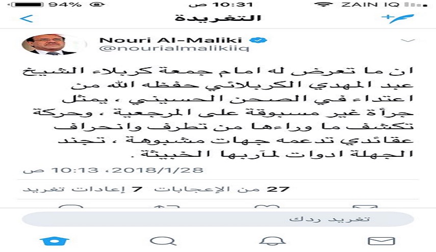 وكتب المالكي، في تغريدة له على موقع "تويتر" اليوم (28 كانون الثاني 2018)، قائلا ان "ما تعرض له ممثل المرجعية الدينية، عبد المهدي الكربلائي، من اعتداء داخل الصحن الحسيني يمثل جرأة غير مسبوقة على المرجعية، وحركة تكشف ما وراءها من تطرف وانحراف عقائدي تدعمه جهات مشبوهة، تجند الجهلة أدوات لمآربها الخبيثة".