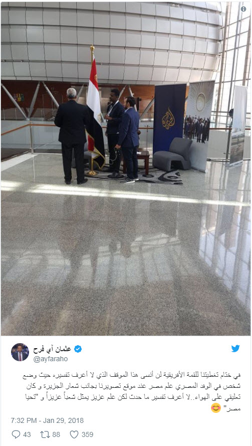 وعلق الإعلامي “آي فرح” في تدوينة له عبر “تويتر” على واقعة قيام احد أعضاء الوفد المصري بوضع العلم المصري في الموقع الخاص بقناة “الجزيرة لتغطية القمة قائلا:” في ختام تغطيتنا للقمة الأفريقية لن أنسى هذا الموقف الذي لا أعرف تفسيره حيث وضع شخص في الوفد المصري علم مصر عند موقع تصويرنا بجانب شعار الجزيرة و كان تعليقي على الهواء.. لا أعرف تفسير ما حدث لكن علم عزيز يمثل شعباً عزيزاً و “تحيا مصر”.