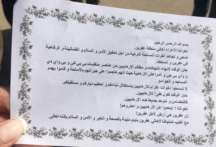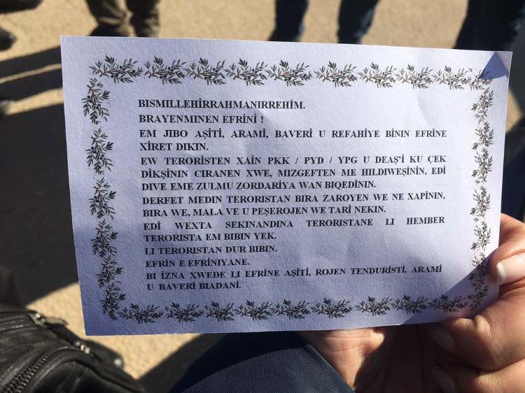 وحذرت المناشير، الأهالي من تطوع الشباب الكردي في وحدات حماية الشعب، بحسب مراسل RT.