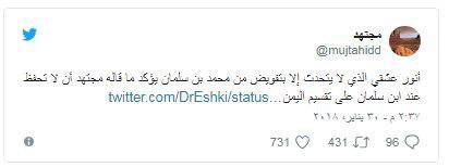 ورغم أن عشقي أكد في التعليقات أن ذلك "رأيه الشخصي" إلا أن التغريدة اعتبرها "مجتهد" تأكيدا لما نشره أمس وعقب عليها قائلا: " أنور عشقي الذي لا يتحدث إلا بتفويض من محمد بن سلمان يؤكد ما قاله مجتهد أن لا تحفظ عند ابن سلمان على تقسيم اليمن".