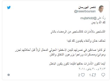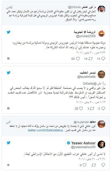 التغريدتان أثارتا جدلا بين النشطاء على مواقع التواصل الاجتماعي، حيث رفض العديد منهم طرح تقسيم اليمن للنقاش واعتبر أن التحالف قد تمت هزيمته.